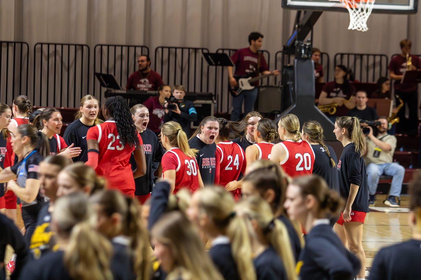 Junior and Virginia native Abby Cooch played all 40 minutes of the contest for the Big Red and finished with a game-high 18 points. Classmate Ada Taute supported her with a double-double, scoring 15 points and grabbing 10 boards in the winning effort.